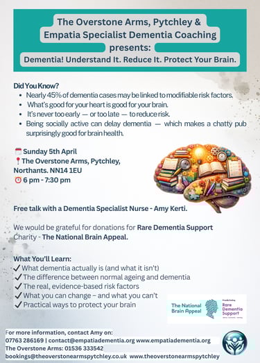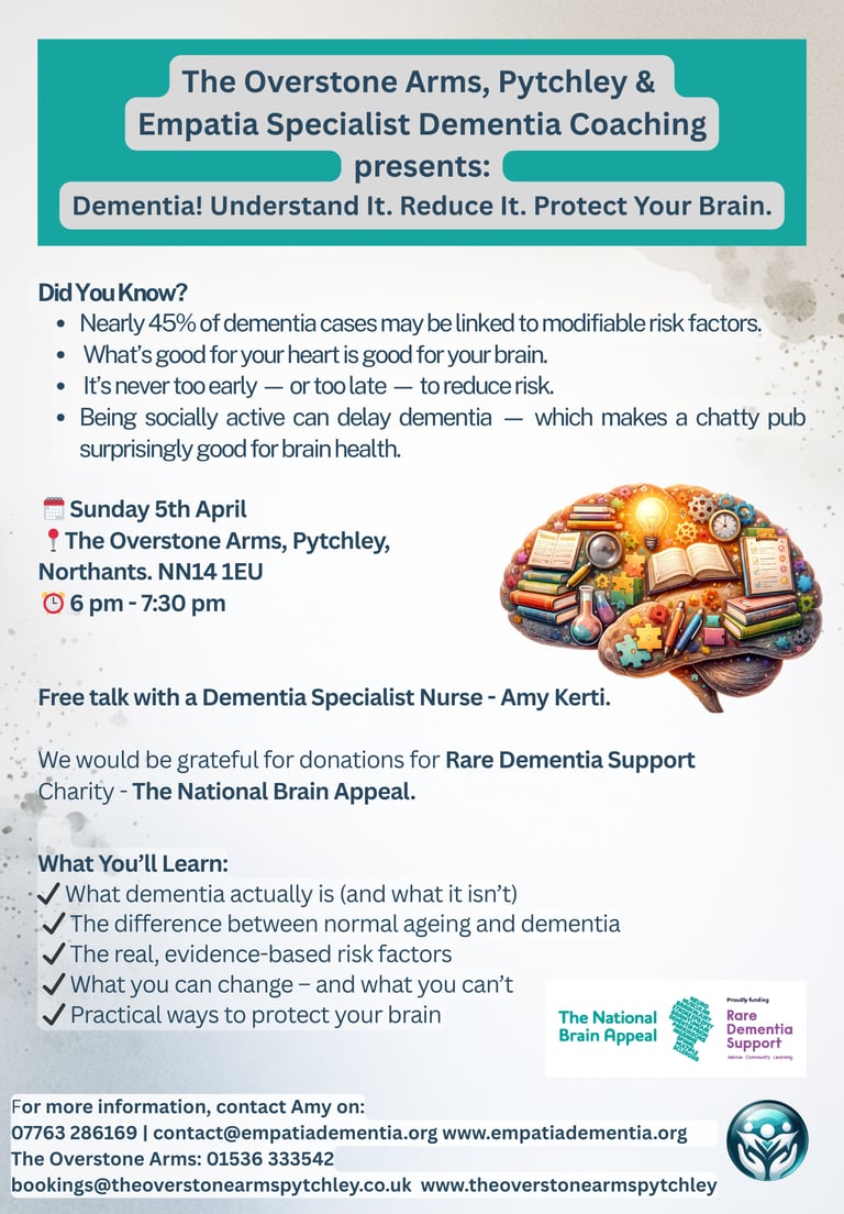 Introduction to Dementia & Dementia Risk Factors - Sunday 5 April at 6.00 pm An education evening at The Overstone Arms with Amy of Empatia. For enquiries, contact Amy at Empatia Specialist Dementia Coaching or Phil at The Overstone Arms.